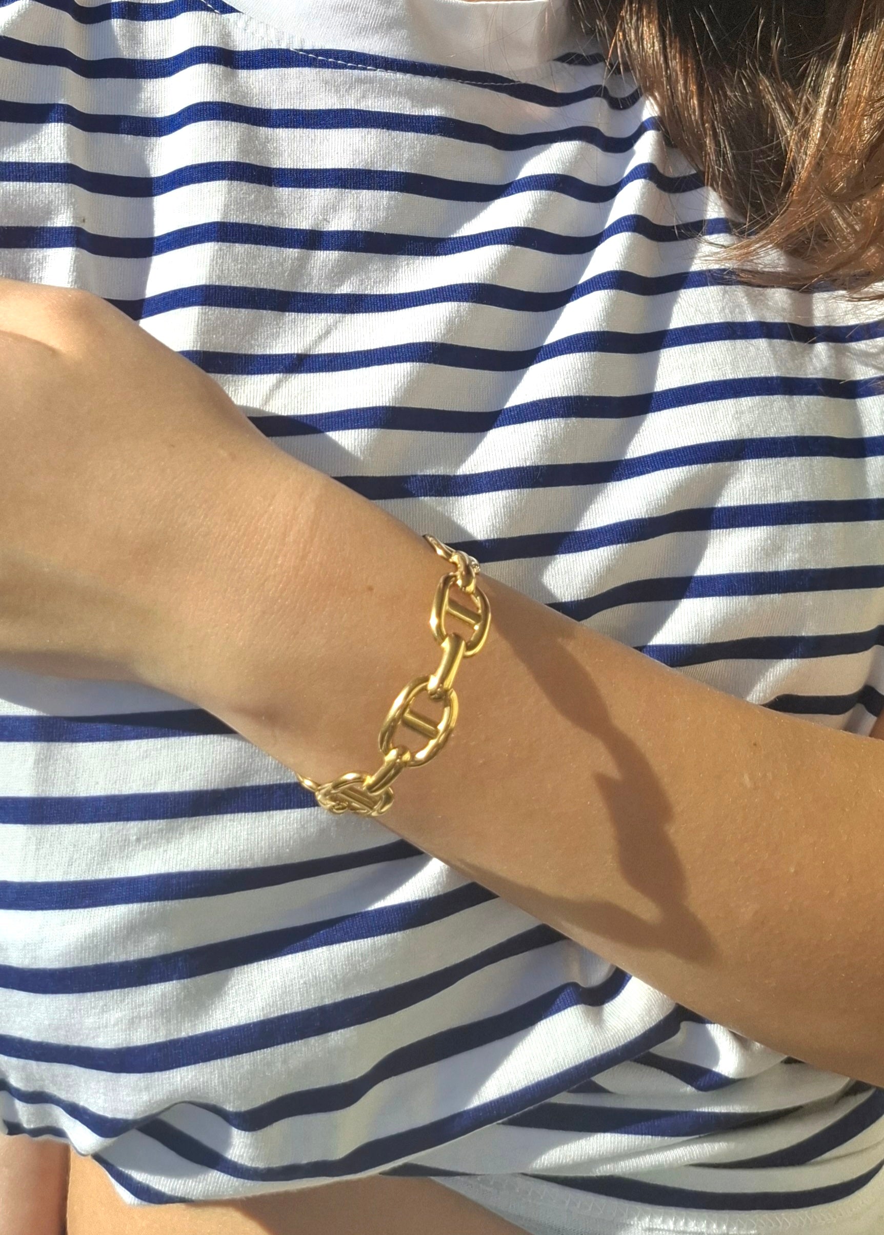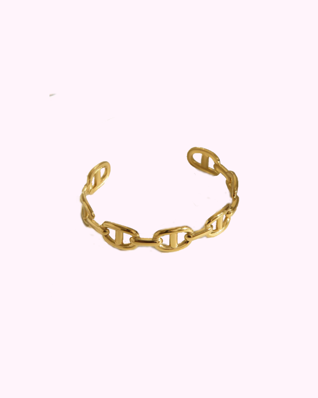 Audacieux, raffiné et en acier inoxydable, le jonc Ililya séduit par son design inspiré de la maille marine, symbole d’élégance intemporelle et de force. ⚓ Avec son épaisseur marquée et son éclat doré, il attire le regard et devient la pièce maîtresse de ton poignet.