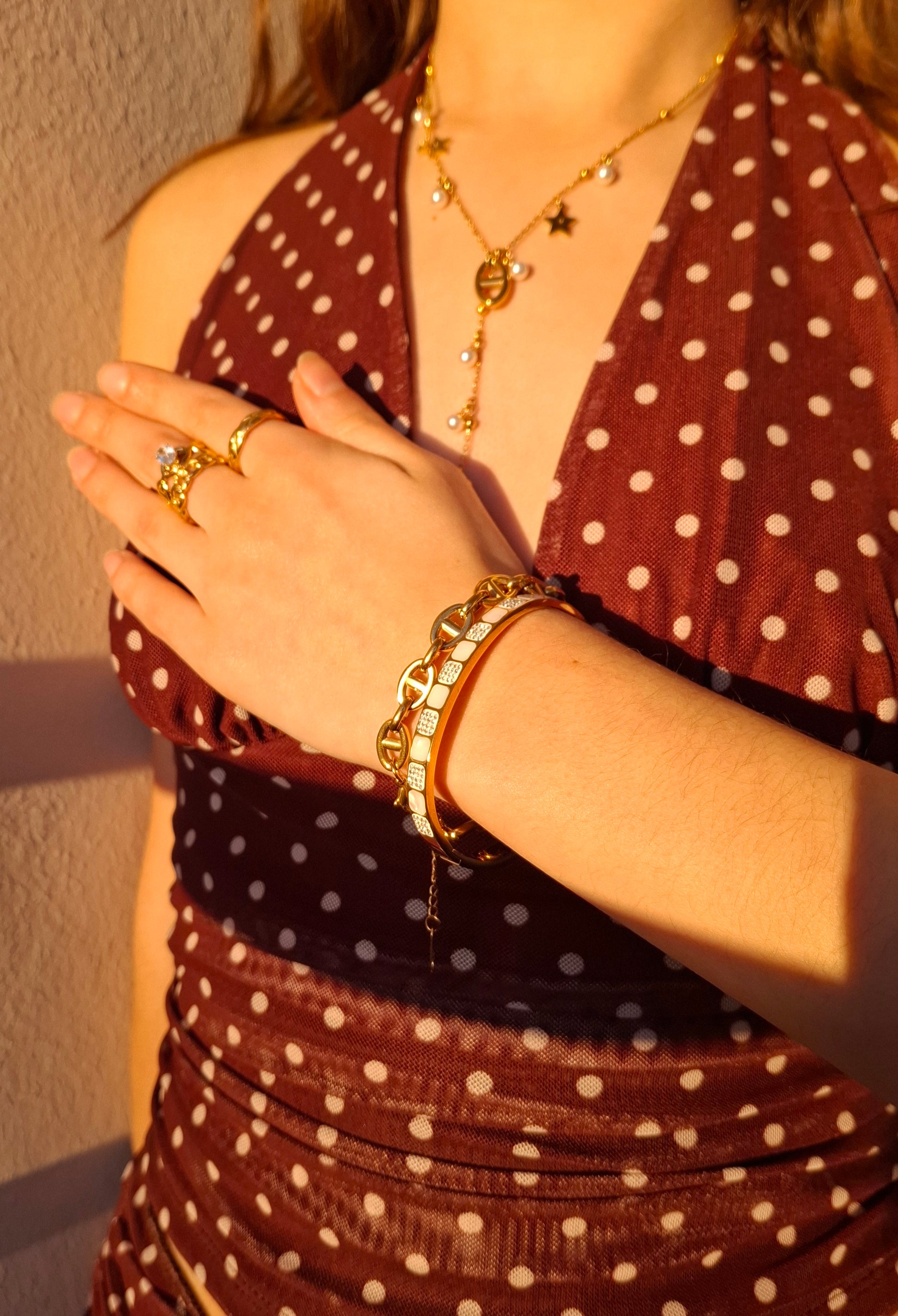 Un joli jonc doré avec des carrés blanc nacré alternant avec des carrés scintillants de strass. Brillant à chaque mouvement, il ajoute une touche girly et pétillante à toutes tes tenues. En acier inoxydable, il reste éclatant au quotidien. ✨